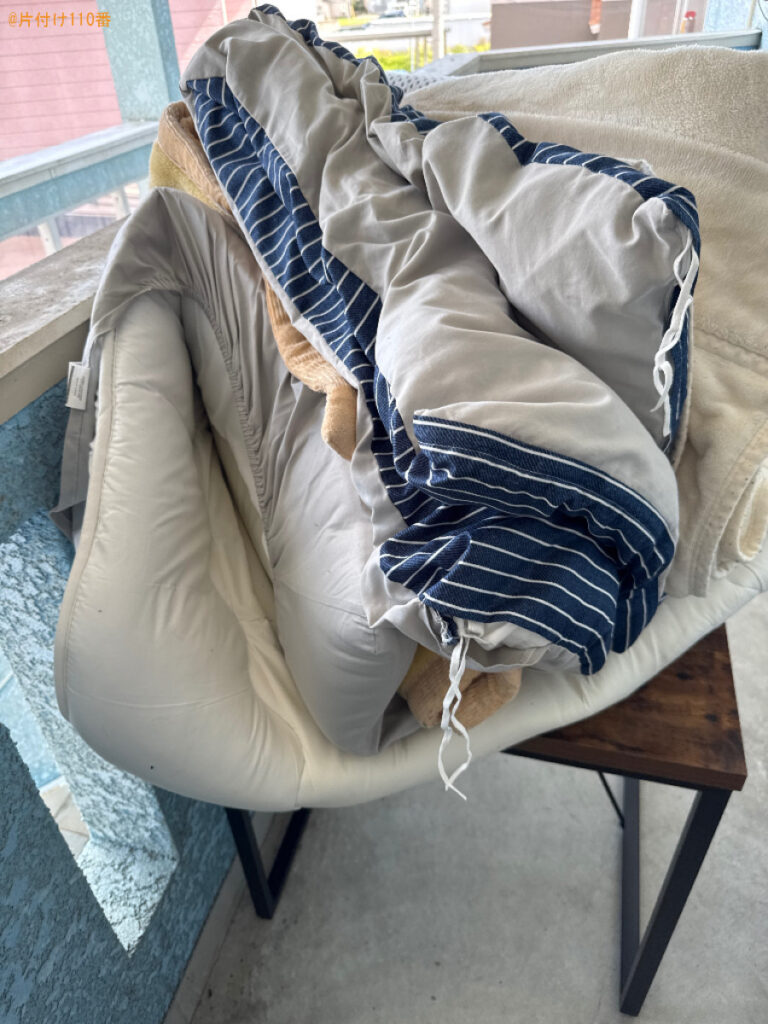 担当のコメント | 家具、布団、ダンボール等の処理にお困りのお客様からご相談いただきました。指定日に回収可能なことがご依頼の決め手になったようです。片付け110番では、最短即日のお伺いが可能です。不用品がございましたらまたいつでもご相談ください。 |